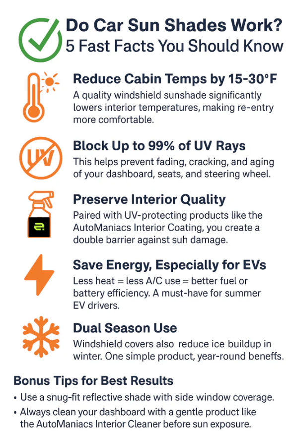 - A high-quality sunshade can reduce interior temperatures by 10–25°C (18–45°F) depending on fit, material, and sun intensity.