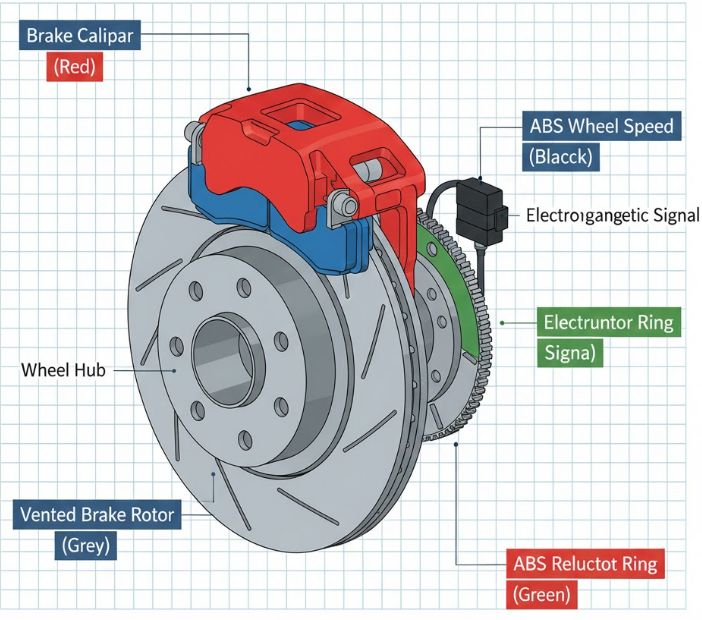 First, each wheel has a wheel speed sensor. These sensors constantly report how fast each wheel is rotating. Under normal conditions, all four wheels slow down together when you brake. But during hard braking, especially on slippery surfaces, one or more wheels may start slowing down much faster than the others. That’s the system’s early warning sign.